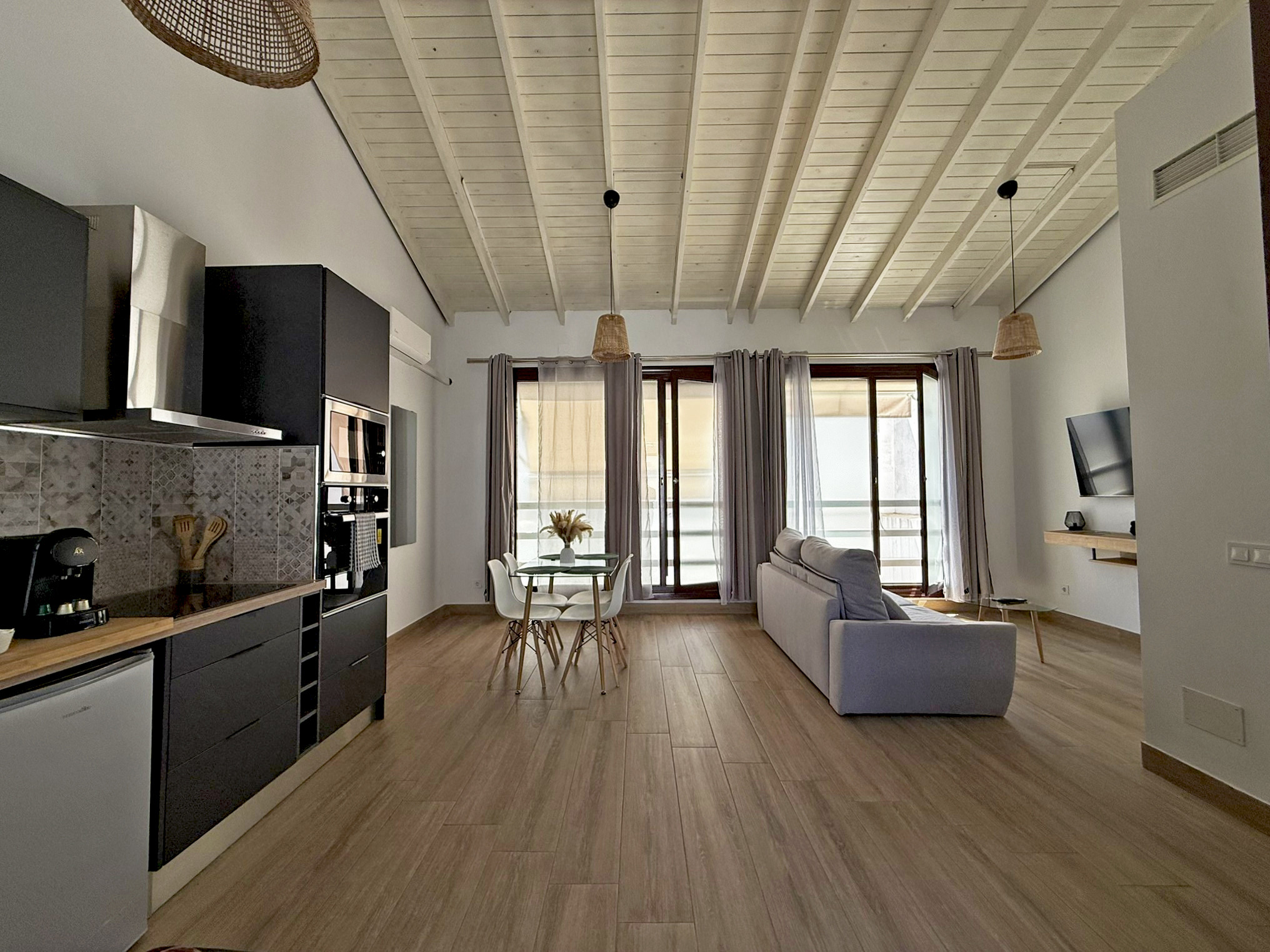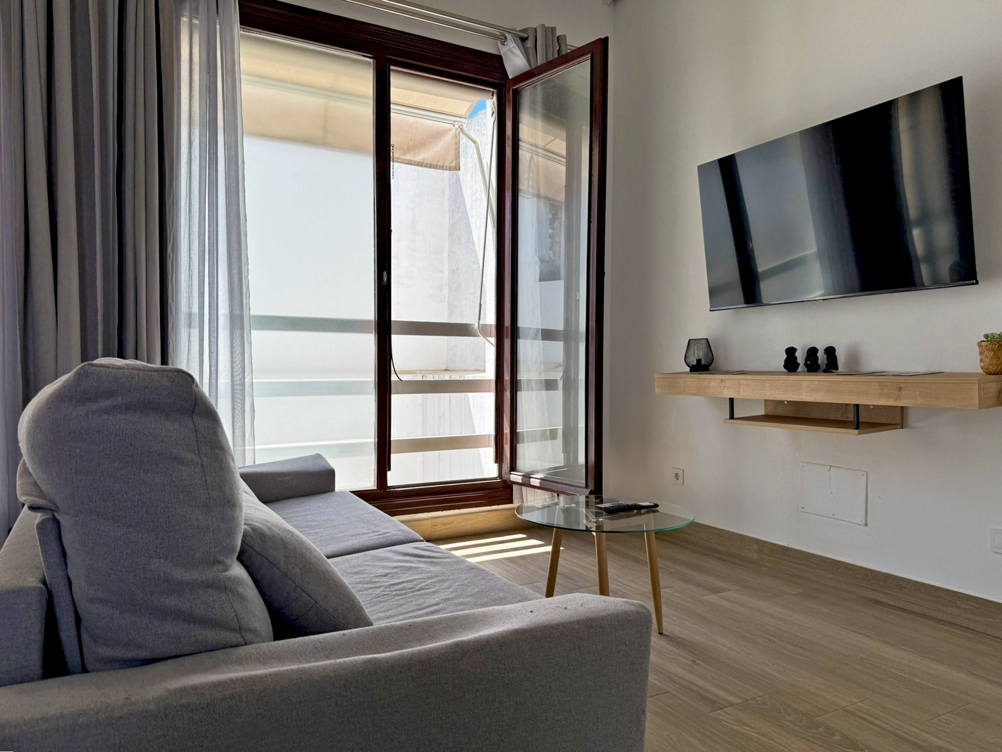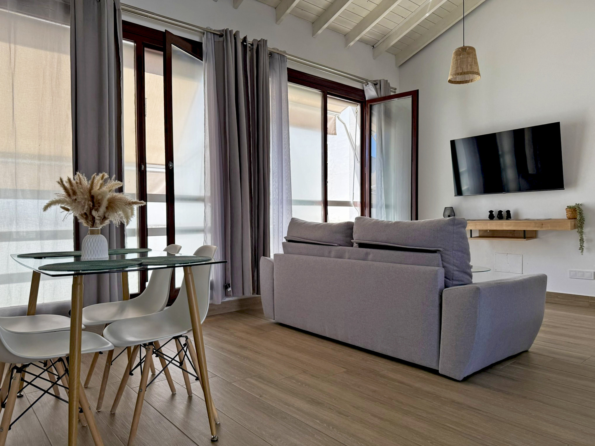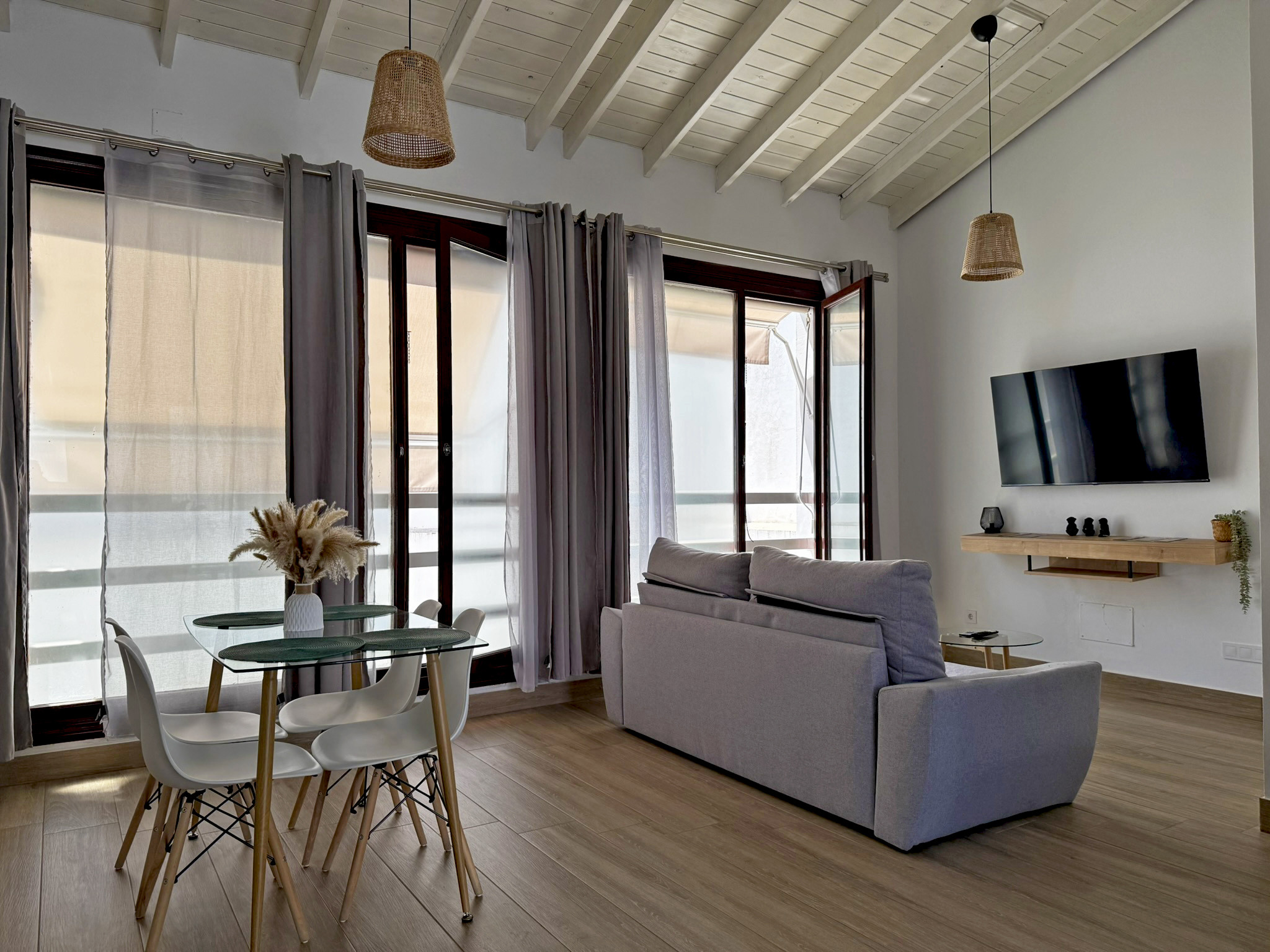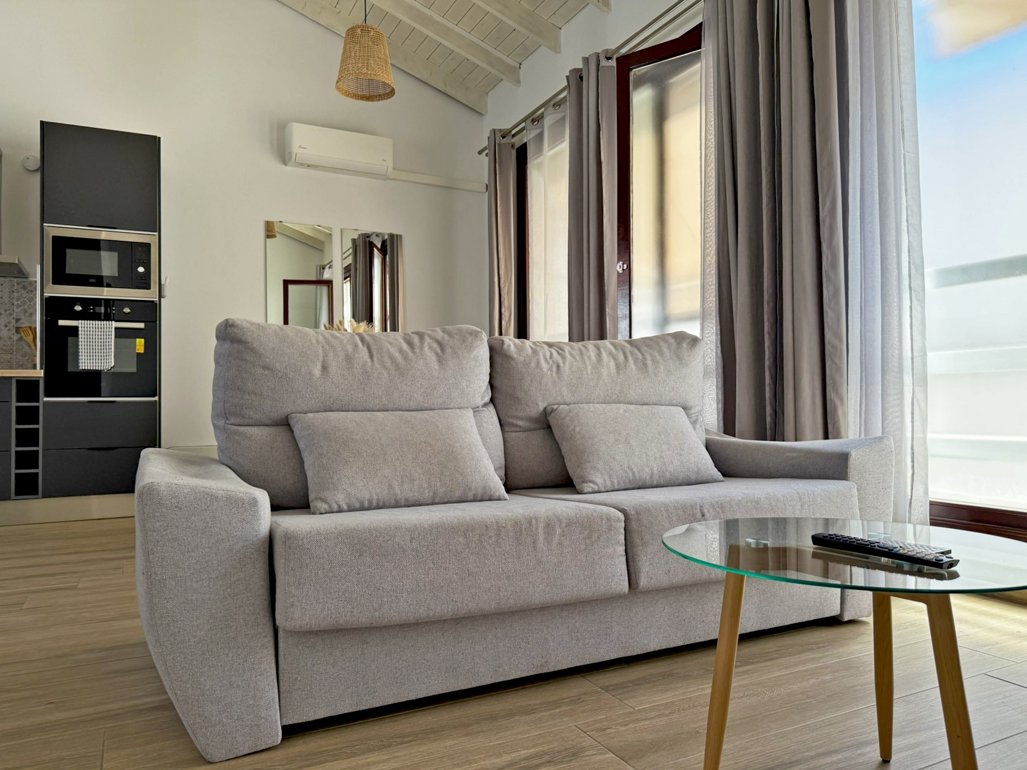 El apartamento dispone de dos camas de matrimonio: una ubicada en un dormitorio independiente que garantiza descanso y privacidad, y otra en un cómodo sofá cama situado en el amplio salón comedor con cocina integrada. Este espacio principal destaca por su gran luminosidad, gracias a sus amplios ventanales que llenan la estancia de luz natural todo el día, aportando un ambiente agradable y acogedor. La vivienda esta equipada con aire acondicionado y Wi-Fi, asegurando una estancia confortable en cualquier época del año. Su distribución abierta y funcional permite disfrutar de cada rincón con comodidad.