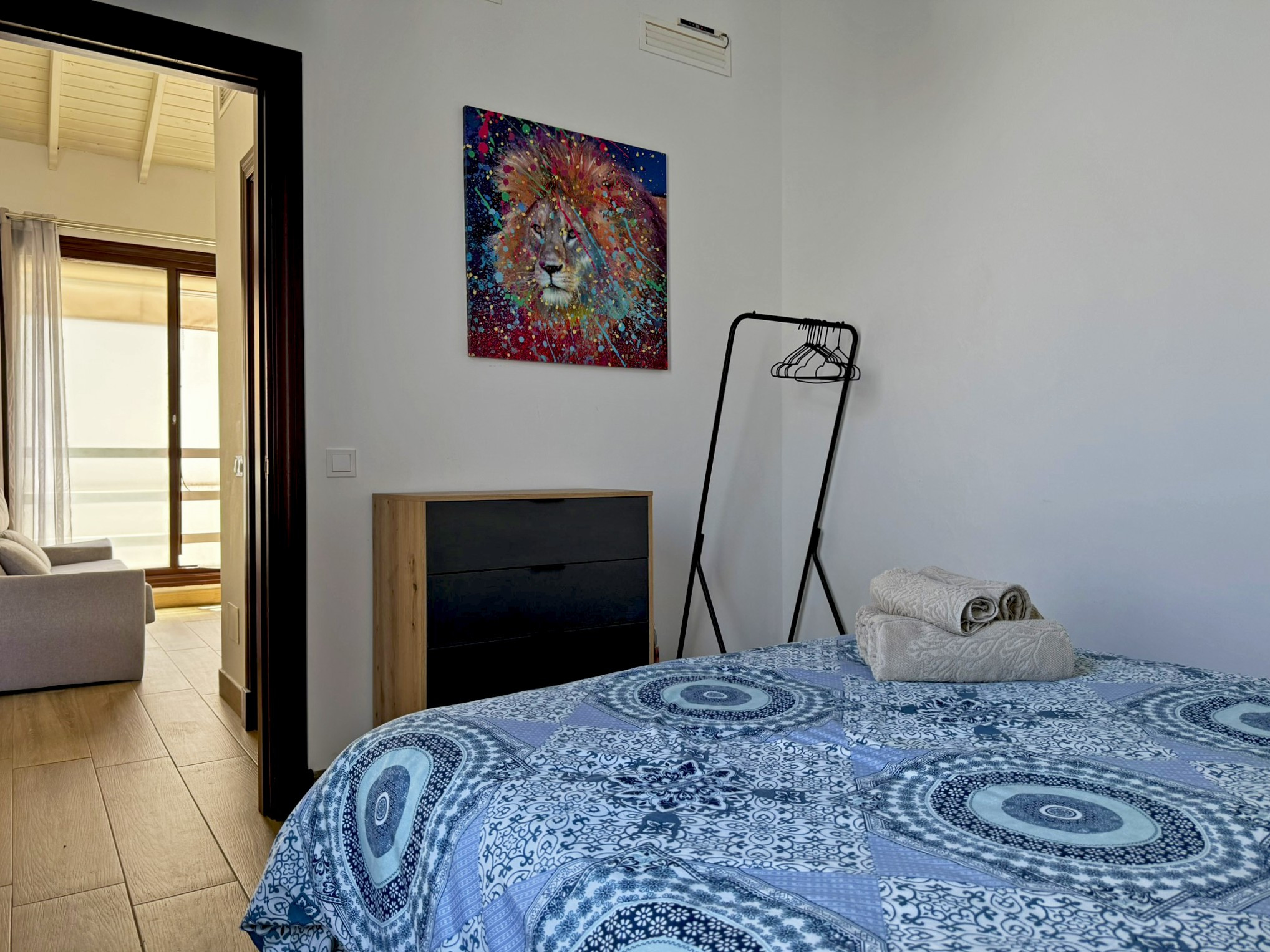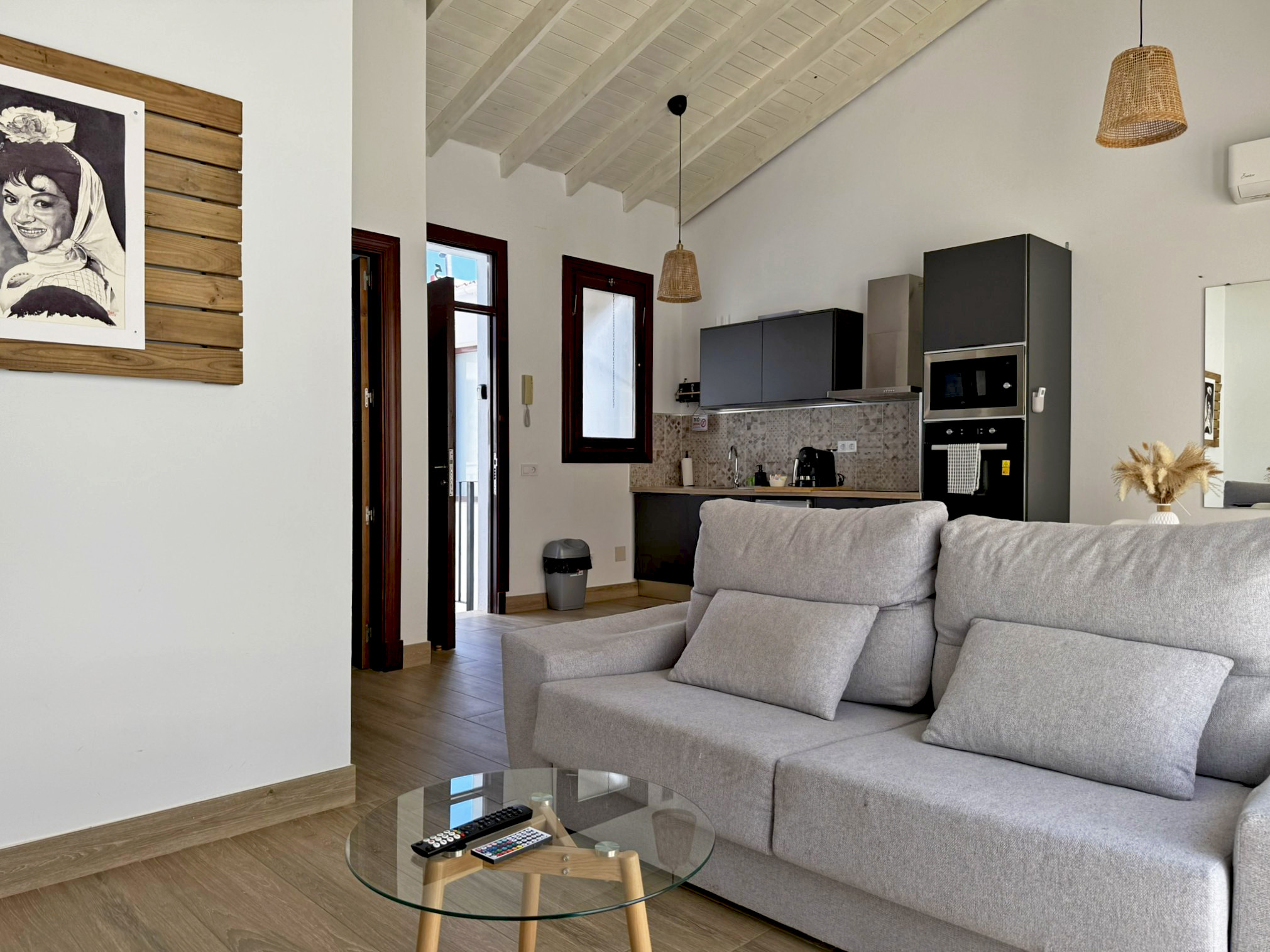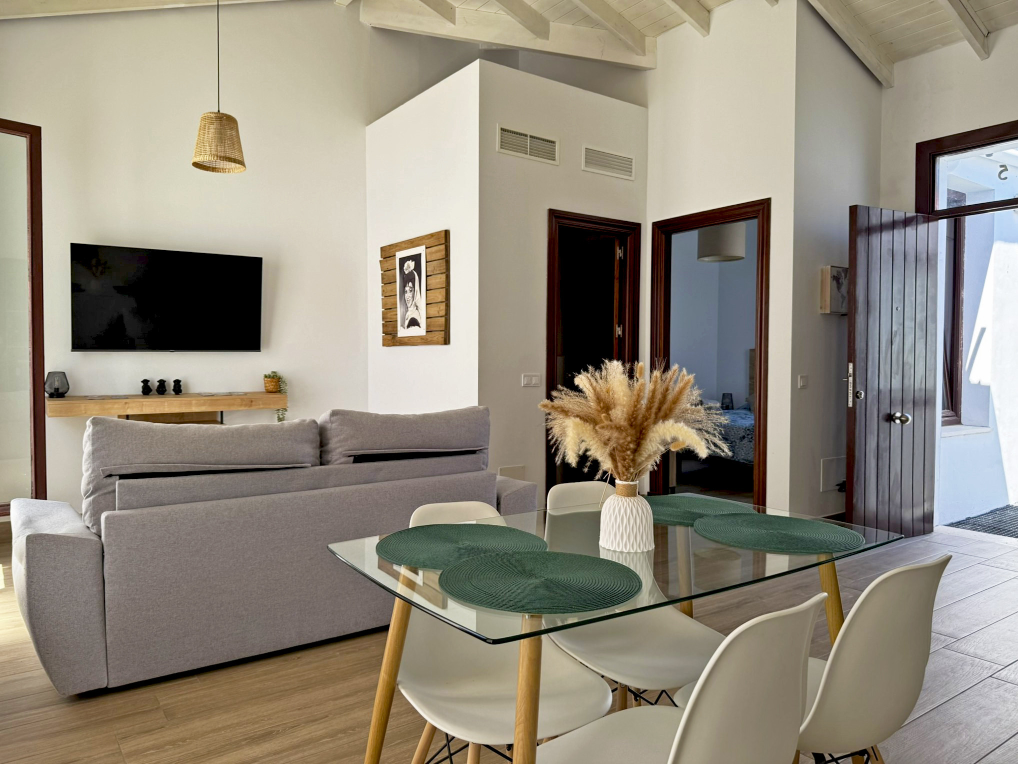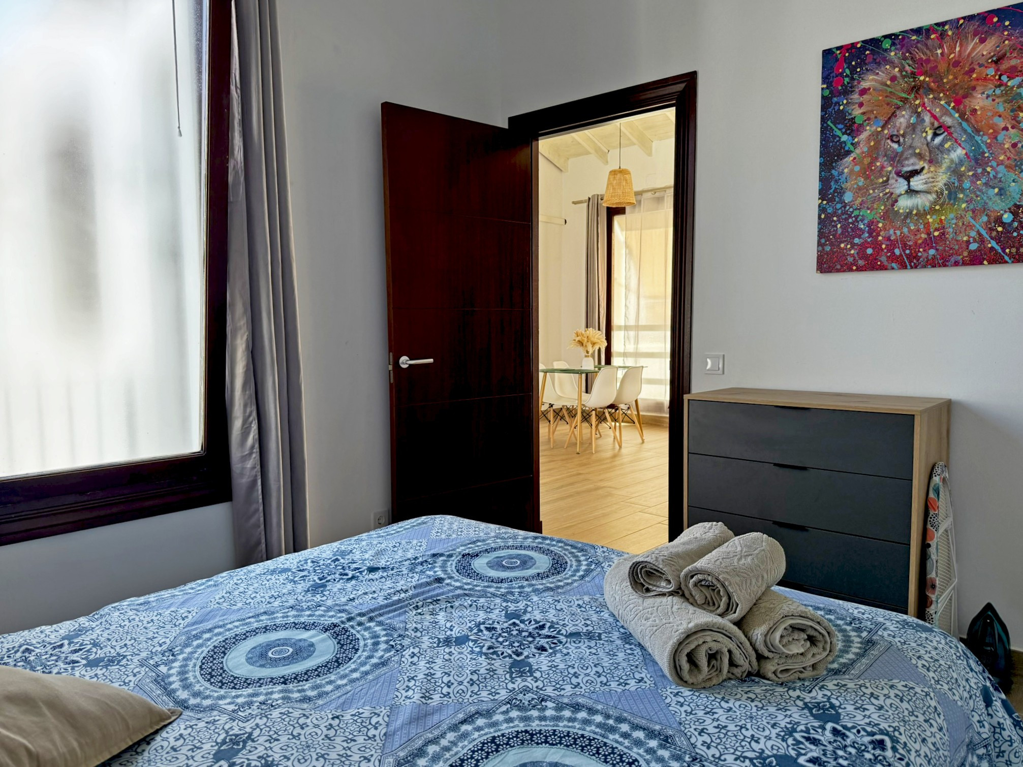 El apartamento dispone de dos camas de matrimonio: una ubicada en un dormitorio independiente que garantiza descanso y privacidad, y otra en un cómodo sofá cama situado en el amplio salón comedor con cocina integrada. Este espacio principal destaca por su gran luminosidad, gracias a sus amplios ventanales que llenan la estancia de luz natural todo el día, aportando un ambiente agradable y acogedor. La vivienda esta equipada con aire acondicionado y Wi-Fi, asegurando una estancia confortable en cualquier época del año. Su distribución abierta y funcional permite disfrutar de cada rincón con comodidad.